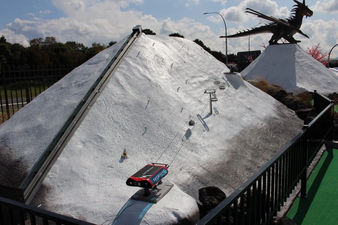 No golfing skill is required as usually it is the kids or the beginners who seem to find the hole first. This mini golf course has many surprises with dragons and steam fields and holes where your ball falls from a skydive plane or rides the magic carpet to the top of the ski field and comes tumbling down the mountainside.